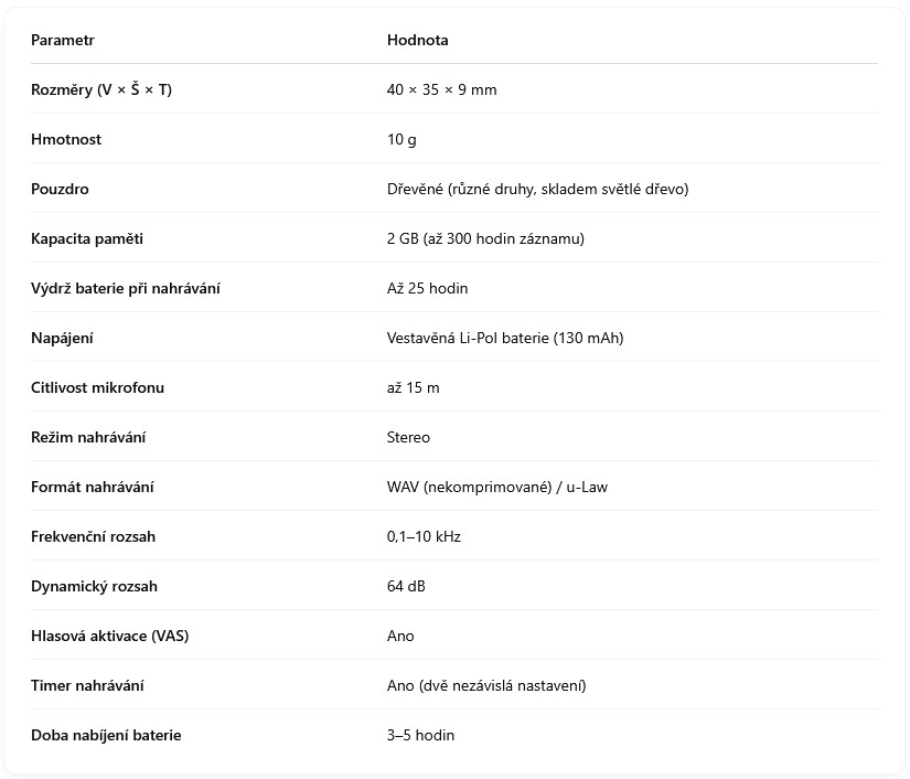 Digitální podpis potvrzuje, že s nahrávkou nebylo nijak manipulováno a je časově ověřitelná.Dřevěné provedení