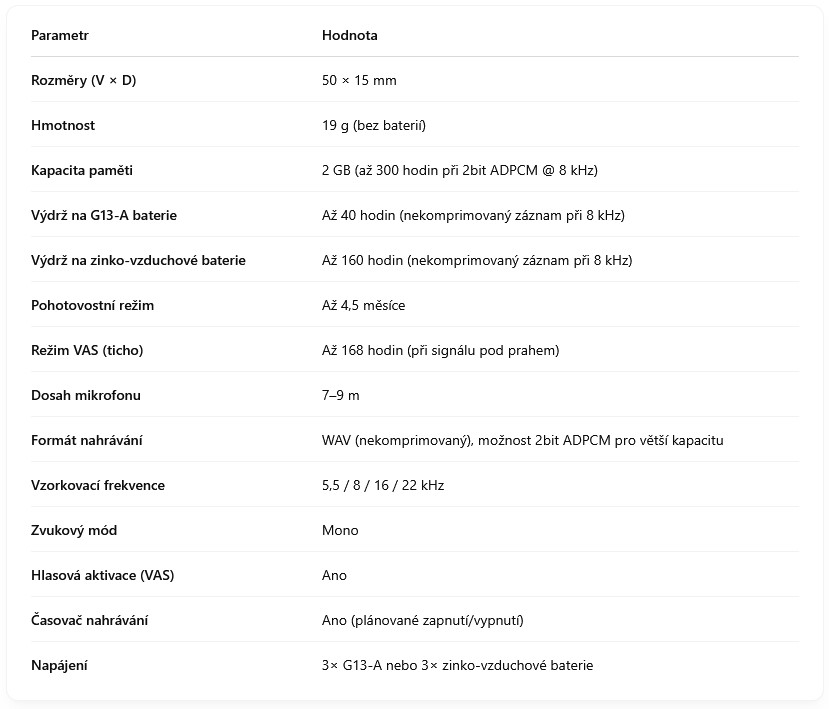 Tři knoflíkové baterie G13-A: Až 40 hodin nahrávání bez komprese (8 kHz).